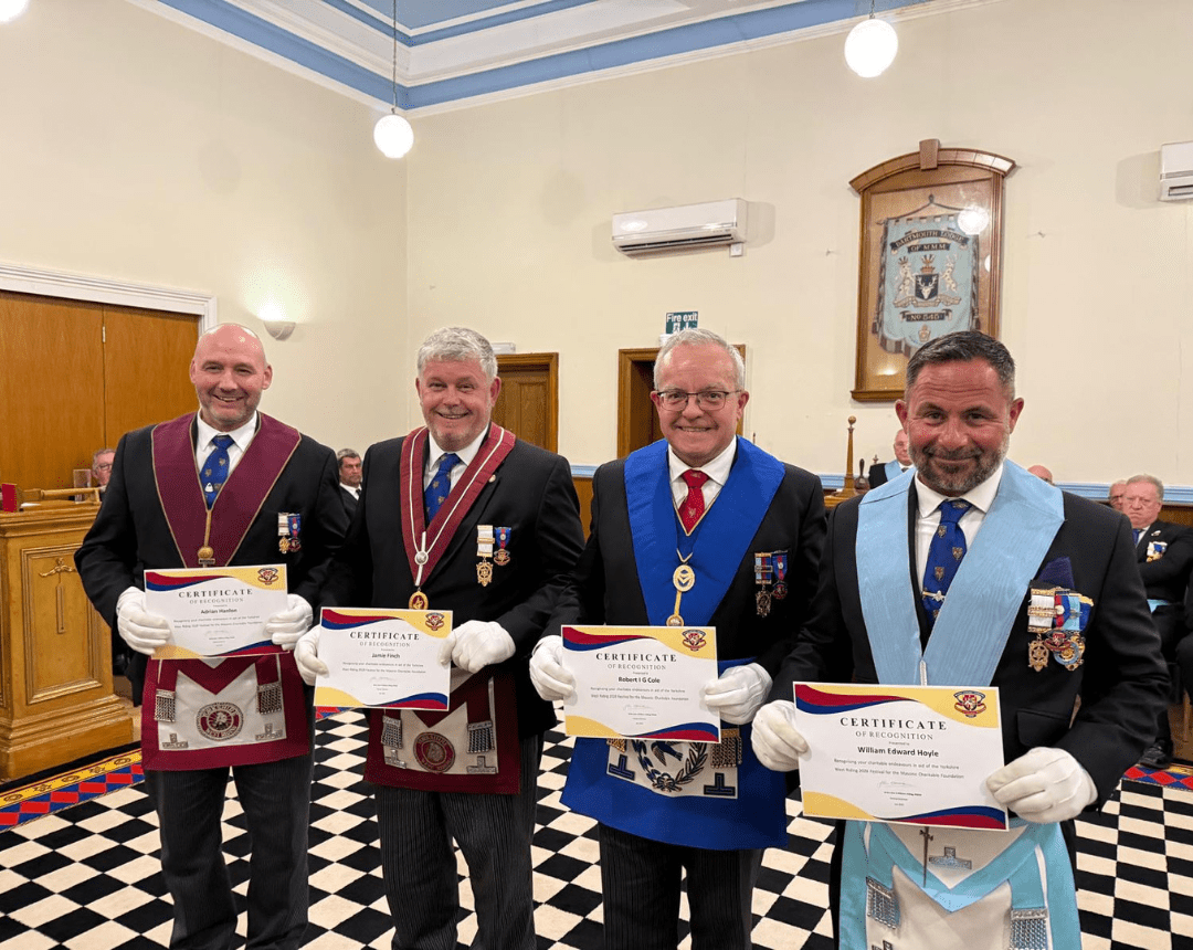 As part of the evening’s proceedings, four charity certificates for the recent Zip Wire Challenge were presented to W Bro Robert Cole, W Bro Adrian Hanlon, W Bro Will Hoyle, and W Bro Jamie Finch, recognising their dedication and efforts in support of charitable causes.