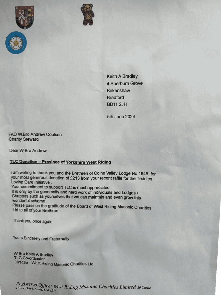 The Brethren of Colne Valley Lodge No. 1645 have been commended for their generous donation of £213 to the Teddies for Loving Care (TLC) initiative. The funds were raised during a recent raffle, showcasing the Lodge’s ongoing commitment to supporting charitable causes.