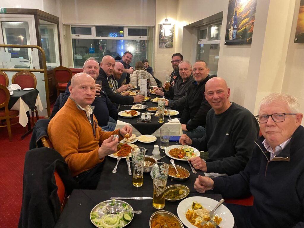 Some of the brethren of the lodge enjoying a curry on a social occasion.